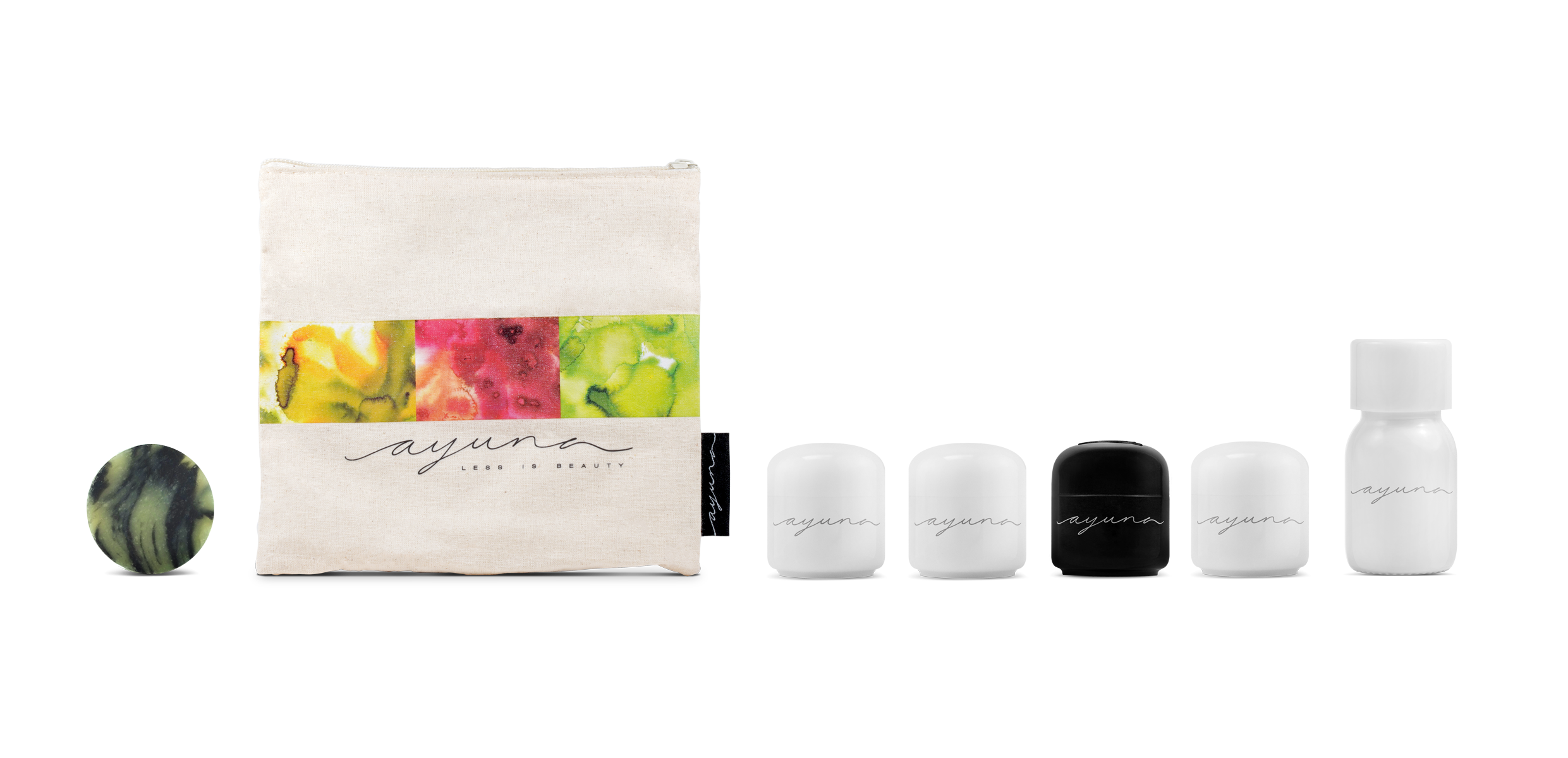 Beauty bag filled with every step in the Topical Fasting program - an artisan detoxifying cleansing soap, an advanced treatment cream based on botanical cell cultures, a dual-acting protein-based exfoliant, a tightening detoxifying mask, a 6- in-1 exposome protector, and a prebiotic refining concentrate. With AMMA III, discover each of Ayuna’s products or continue enjoying the most pampered care wherever you go.
