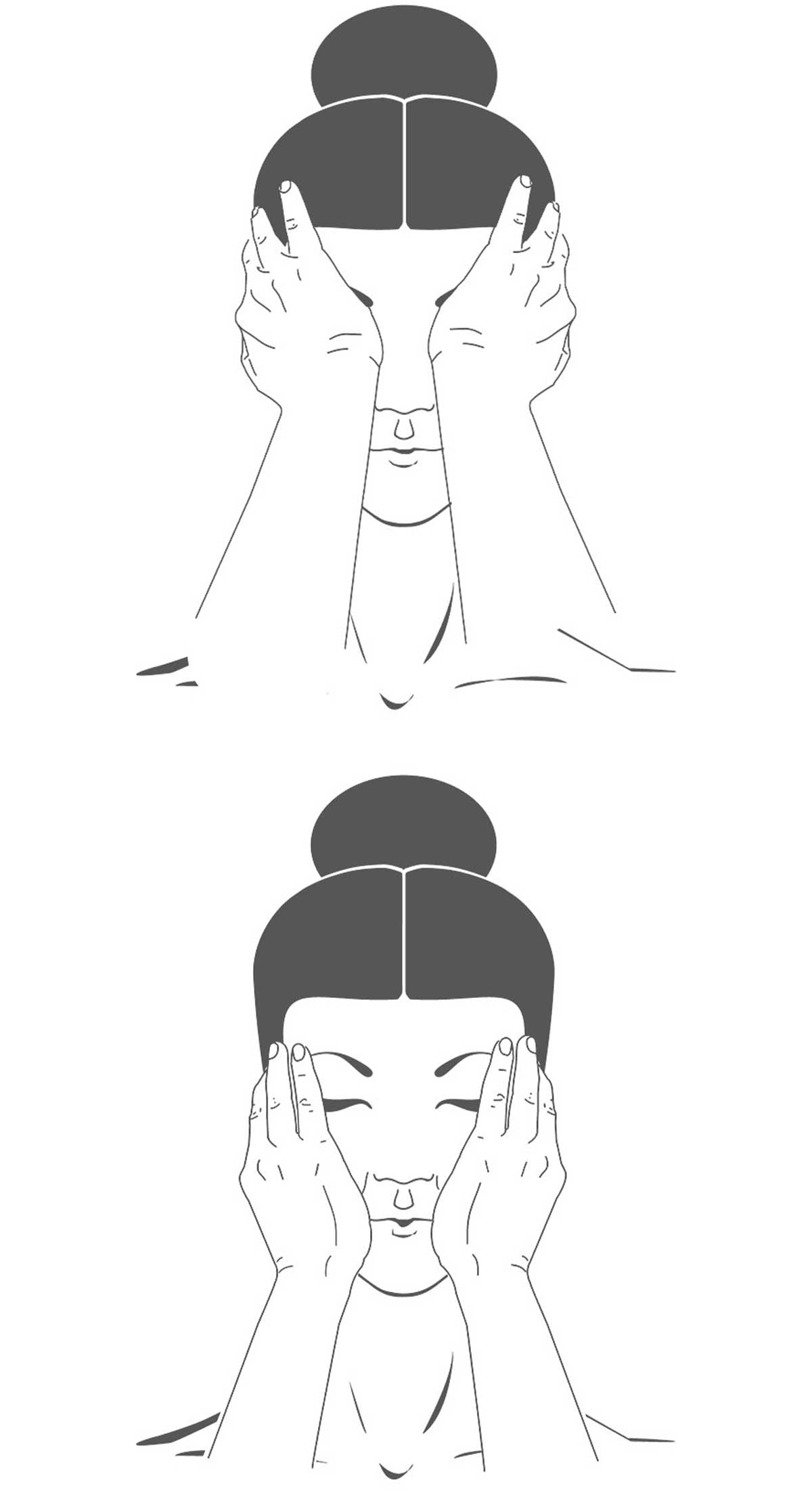 Place both open hands over your face, covering eyes, cheekbones and temples.